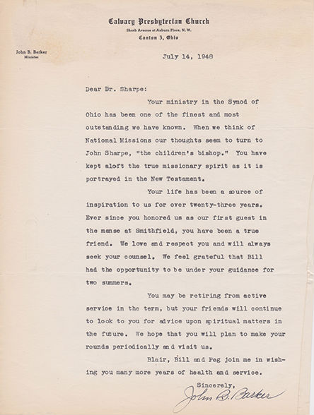 In the July 22, 1950 edition of the publication, Presbyterian Life, Dr Sharpe was honored for his work with more than 200,000 children in Ohio coal country with the article entitled, "The Children's Bishop". Click Here to read that article.