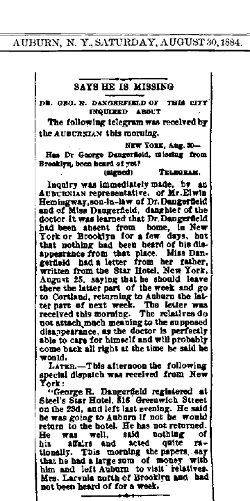 Dr. Daingerfield reported missing, 1884 at age 75. He lived to be 93.